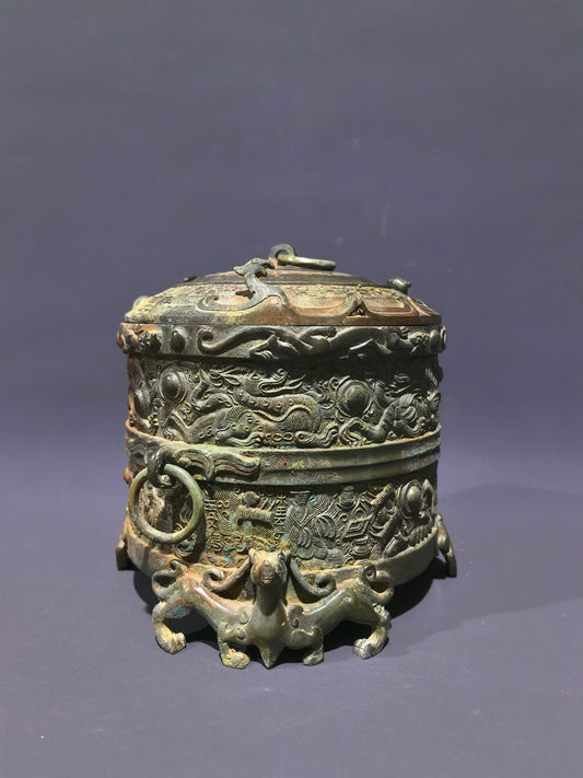 A0041 Vintage Chinese Bronze Low Relief Dragon & Figure Design Wine Warmer