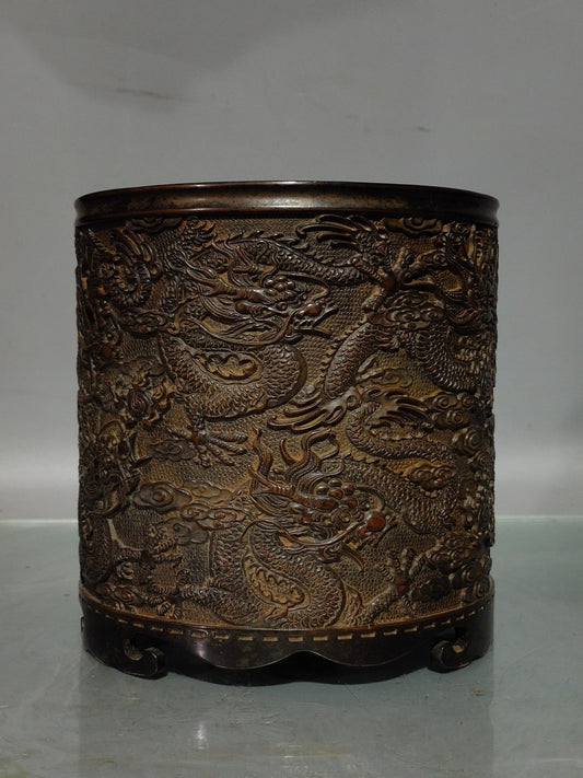A0049 Vintage Chinese Copper Low Relief Fortune Dragon Design Brush Pot