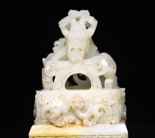 A0079 Vintage Chinese Qing Dynasty White Hetian Jade Carved Fortune Dragon Seal