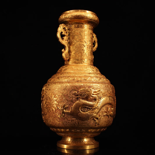 A0071 Old Chinese Gilt Gold Copper High Relief Fortune Dragon Double Ears Vase