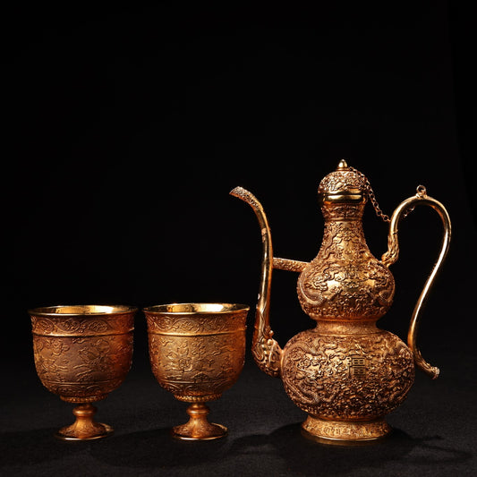 A0072 A Set Vintage Chinese Gilt Gold Copper Low Relief Dragon Design Gourd Wine Pot w Cups