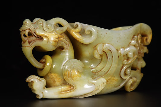 A0106 Vintage Chinese Hetian Jade Carved Dragon Phoenix Wine Cup