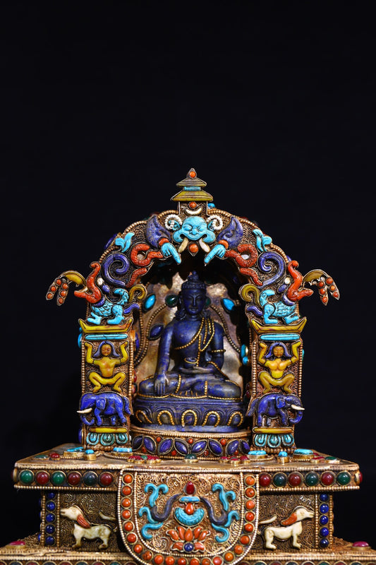 A1525 Tibetan Gold Wires Inlay Lapis Lazuli & Turquoise & Gems Shrines & Lapis Lazuli Medicine Buddha Statue