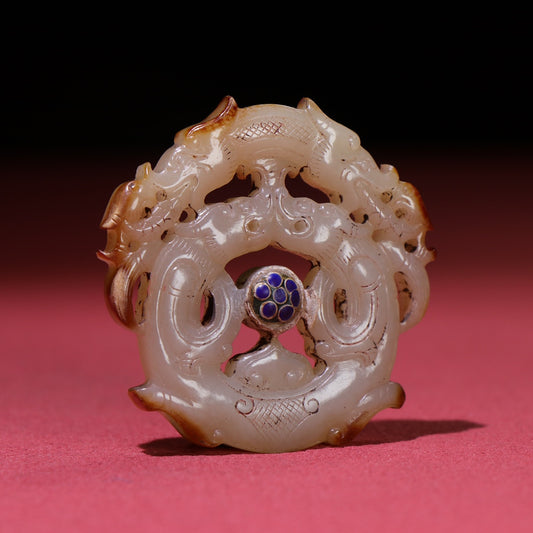 A1002 Openwork Chinese Hetian Jade Inlay Peking Glass Fortune Dragon Pendant