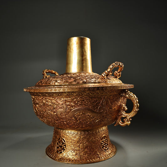 A1074 Vintage Chinese Gilt Gold Copper Fortune Dragon Design Hot Pot Stove