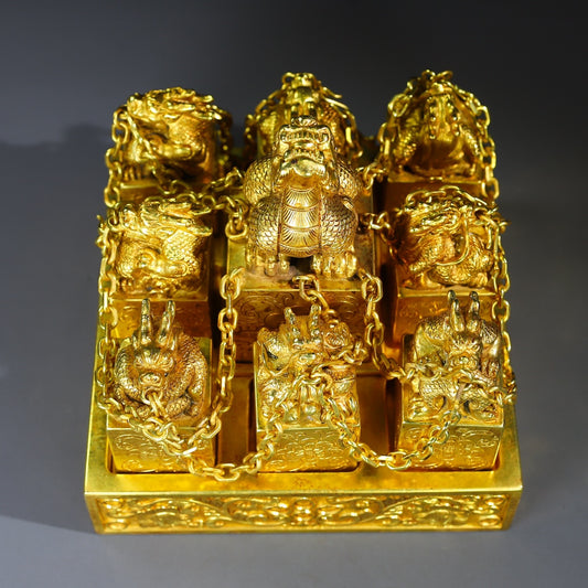 A1125 A Set Vintage Chinese Gilt Gold Copper Nine Dragon Seals