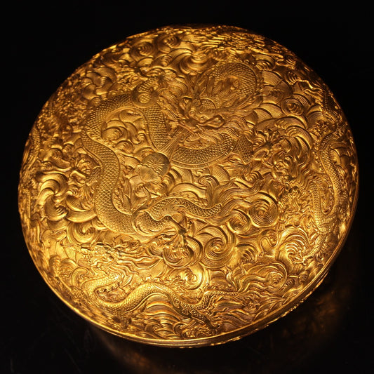 A0421 Vintage Chinese Gilt Gold Copper Low Relief Fortune Dragon Design Jewellery Box