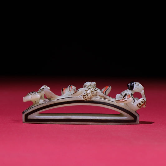 A0427 Vintage Chinese Gilt Gold Lacquerware Hetian Jade High Relief Dragon Phoenix & Figure Belt Buckle