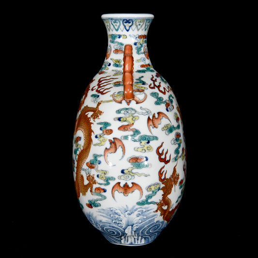A0446 Chinese Gilt Gold Doucai Fortune Dragon Design Double Ears Porcelain Vase