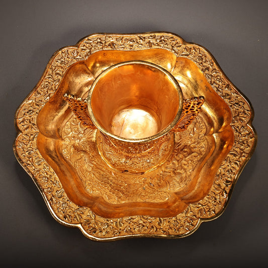 A0452 Vintage Chinese Gilt Gold Copper Low Relief Dragon Design Double Ears Wine Cup w Saucer