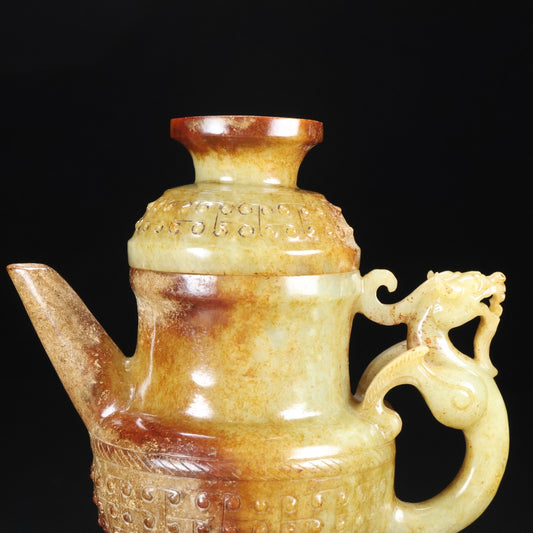 A0483 Old Chinese Hetian Jade Carved Fortune Dragon Wine Pot