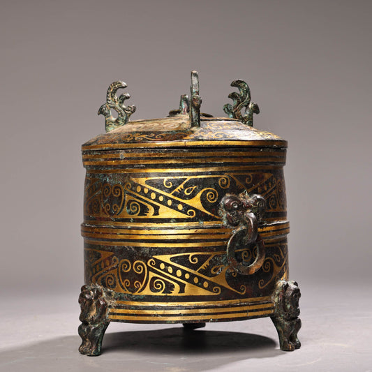A0449 Chinese Ming Dynasty Gilt Gold Copper Low Relief Chi Dragon Design Double Ears Incense Burner