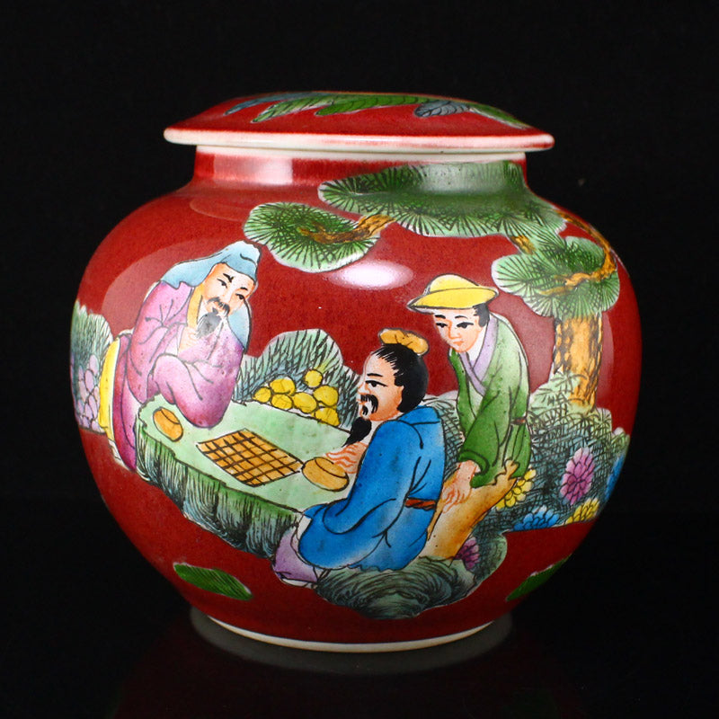 A Pair Red Glaze & Famille Rose Sages Meeting Design Porcelain Weiqi Pot