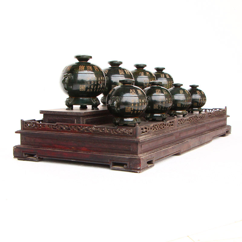 A Set Eight Deep Green Hetian Jade Poetic Prose Double Ears 3 Legs Incense Burner