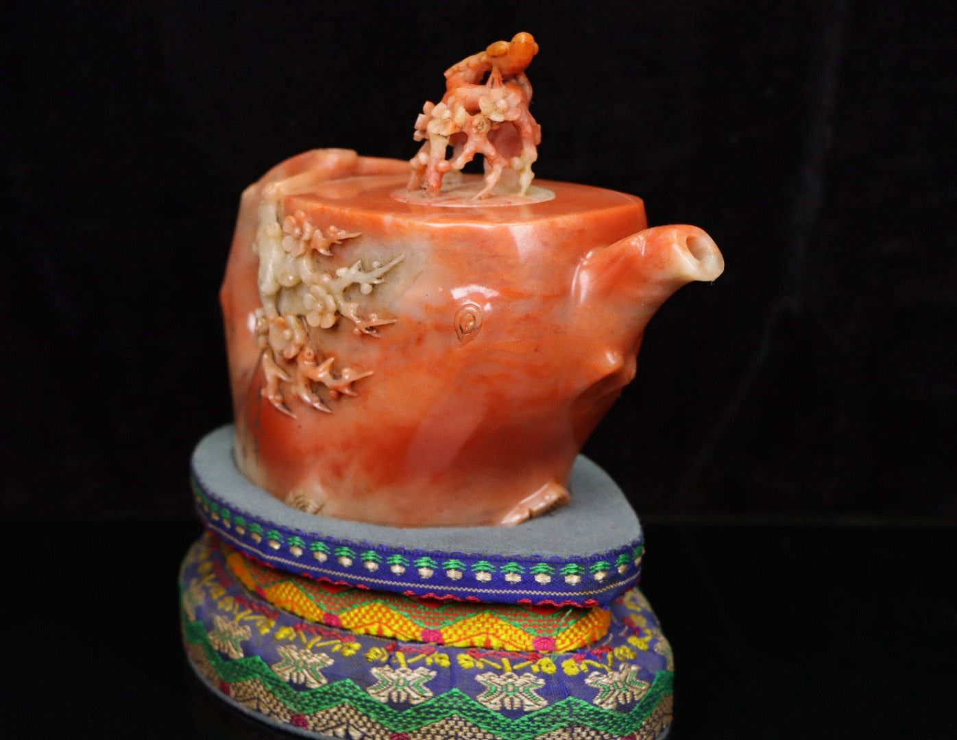 A0010 Vintage Chinese Shoushan Stone Carved Plum Flower & Bird Teapot w Box