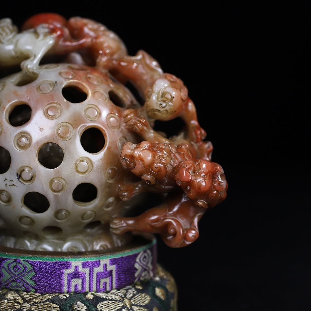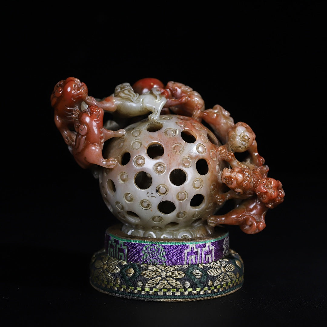 A0216 Openwork Vintage Chinese Shoushan Stone Carved Beast & Ball Statue w Box