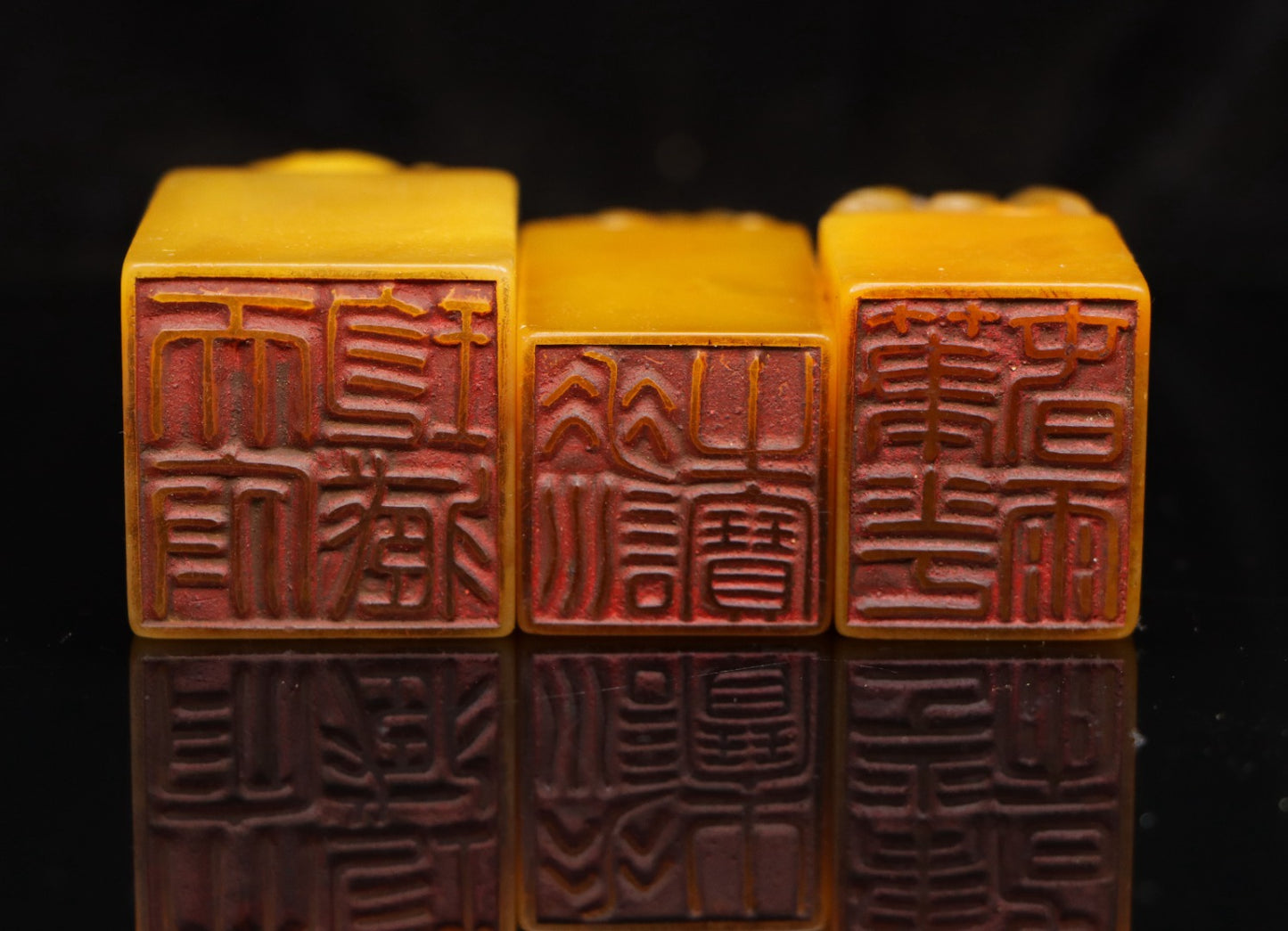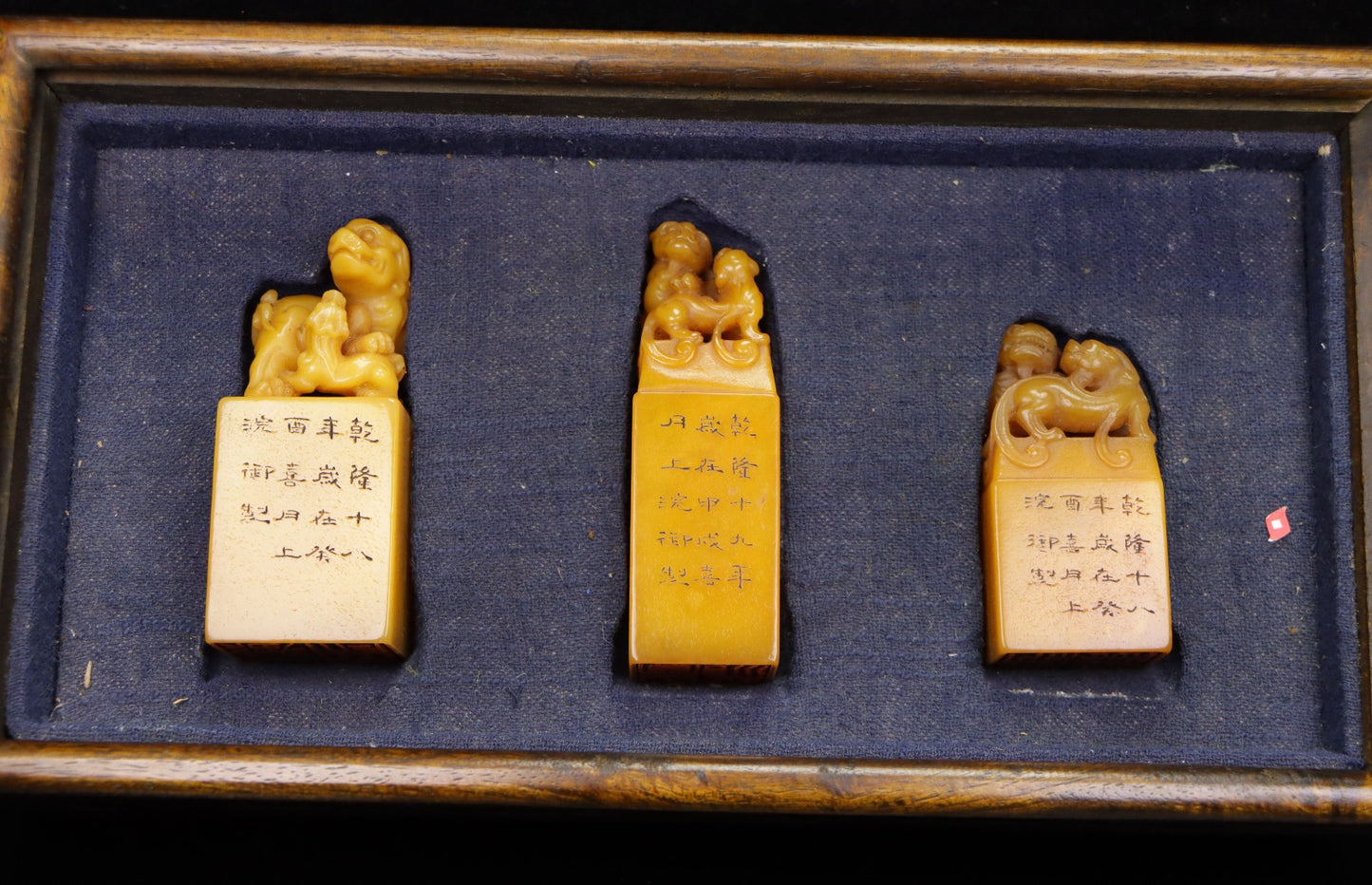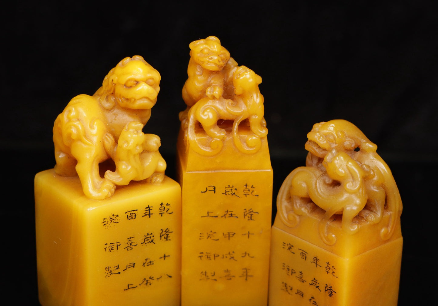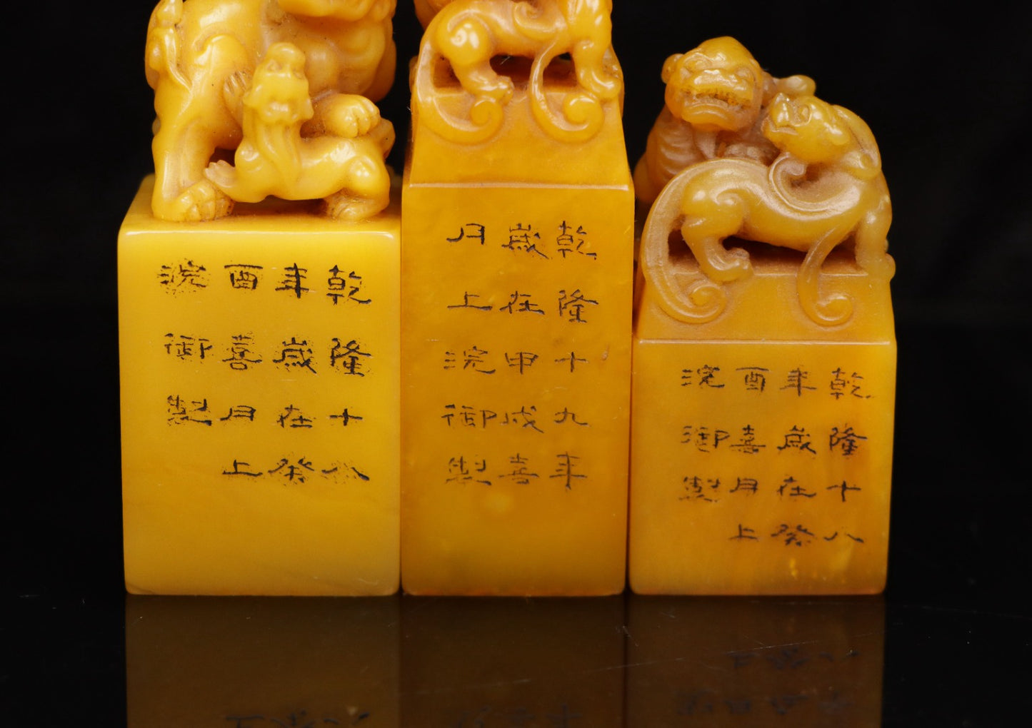A0239 Three Old Chinese Shoushan Stone Tianhuang Stone Carved Beast Seal w Box