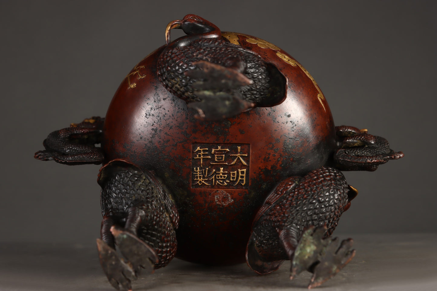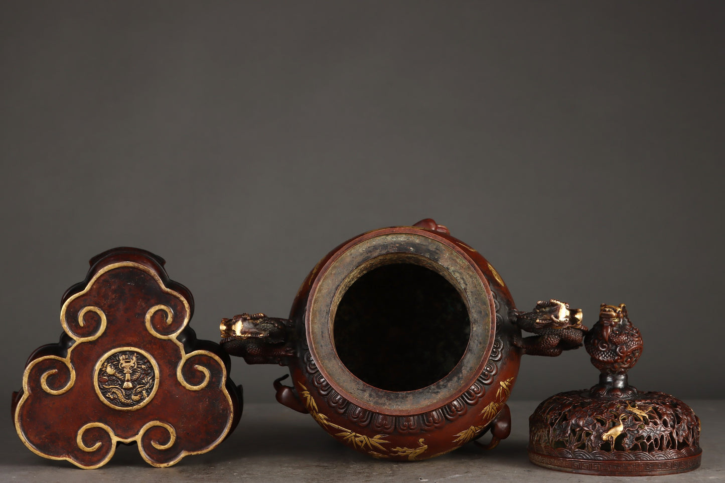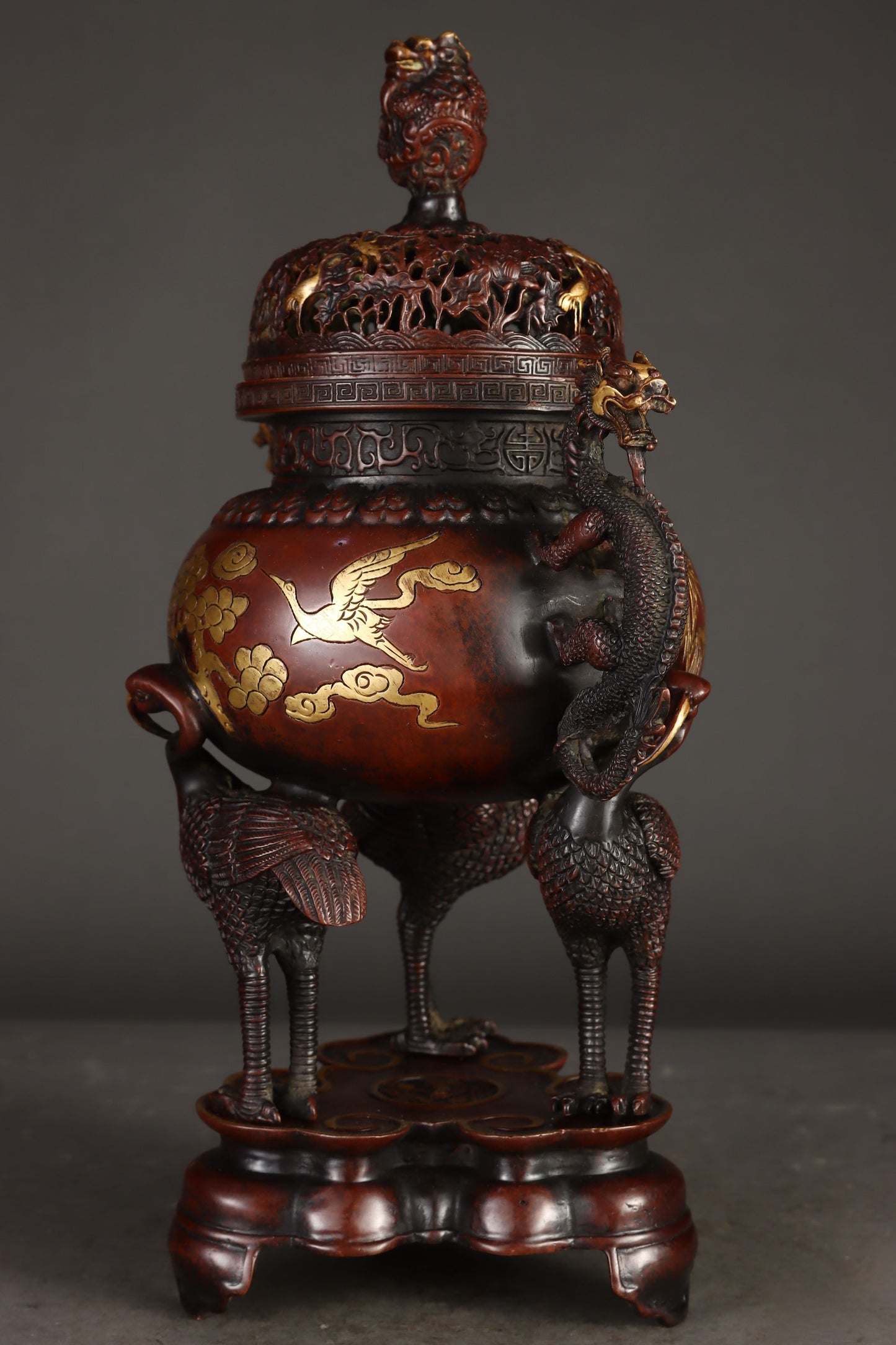 A0403 Vintage Chinese Gilt Gold Copper Double Ears Dragon & Crane Incense Burner