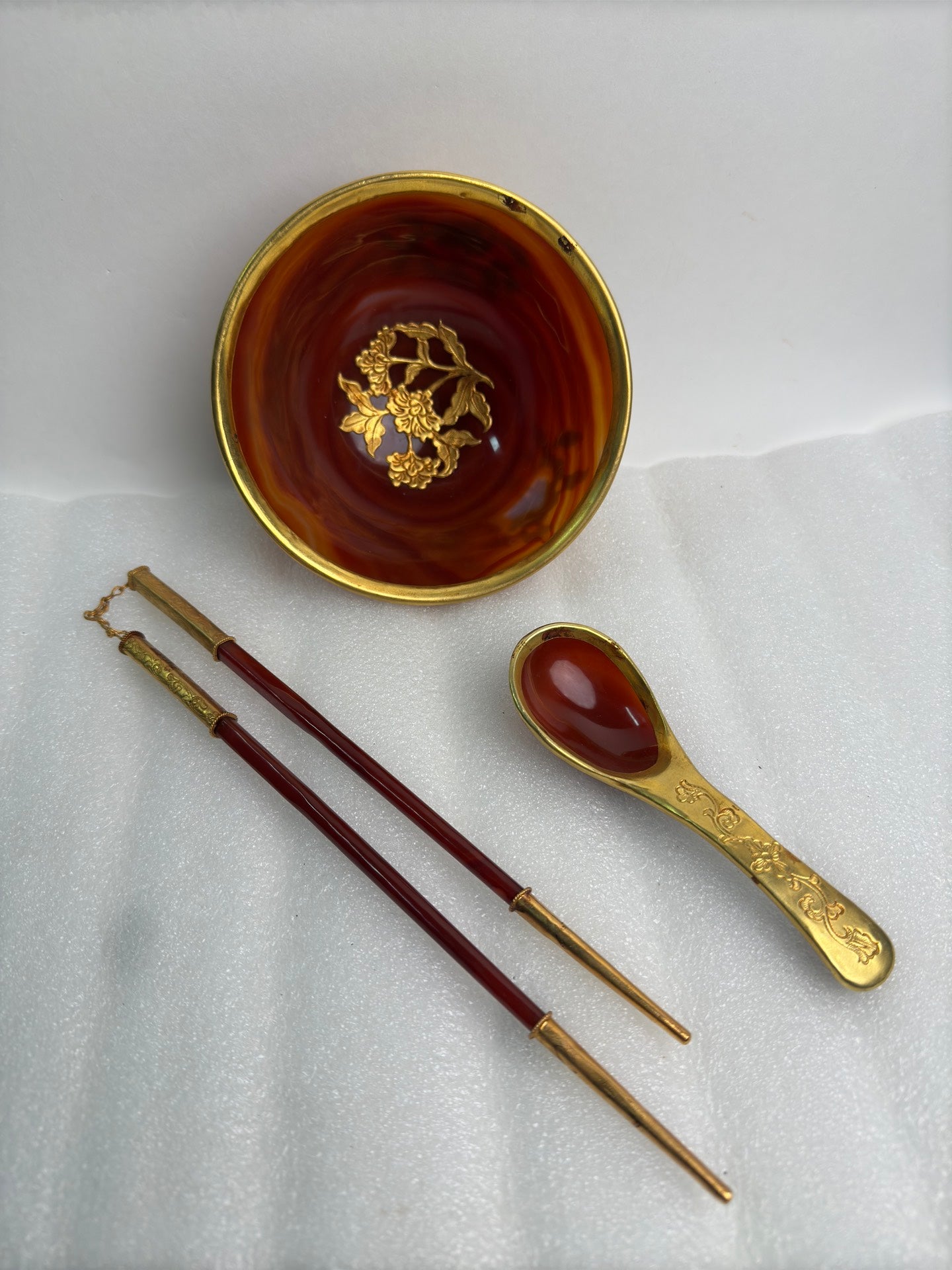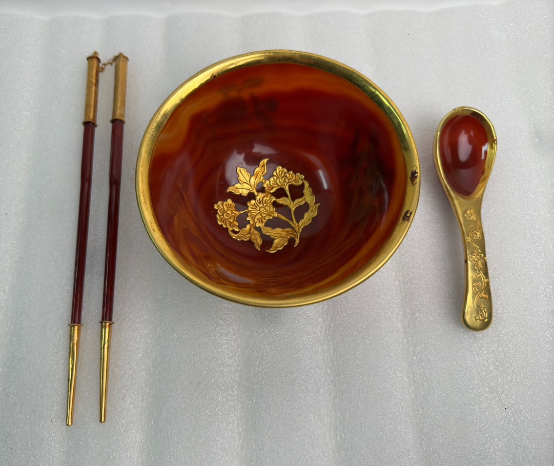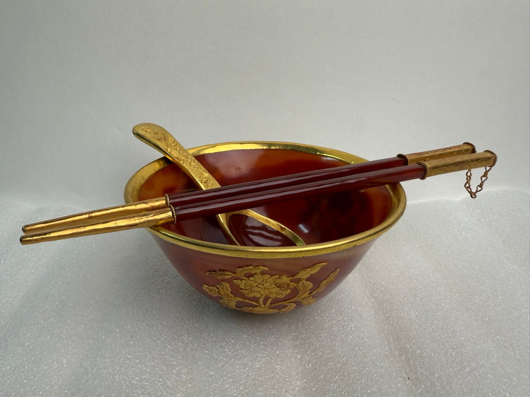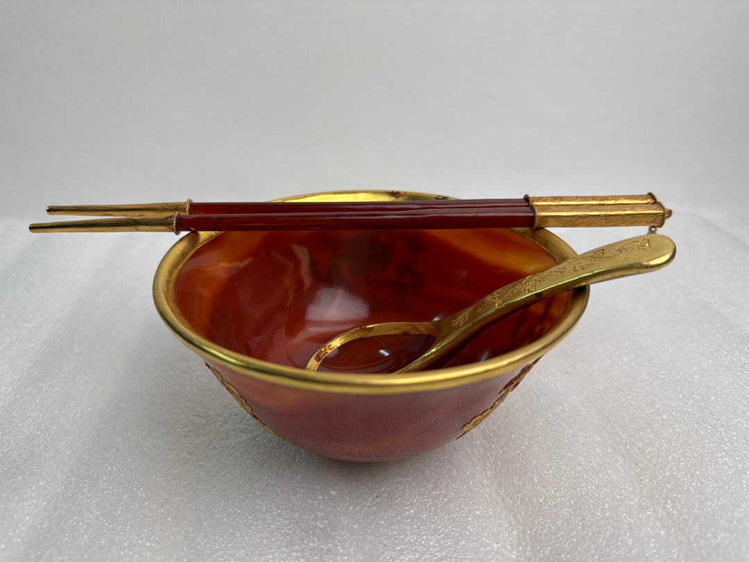 A0598 Chinese Red Agate Inlaying Gold Edge Flower Design Bowl & Chopsticks