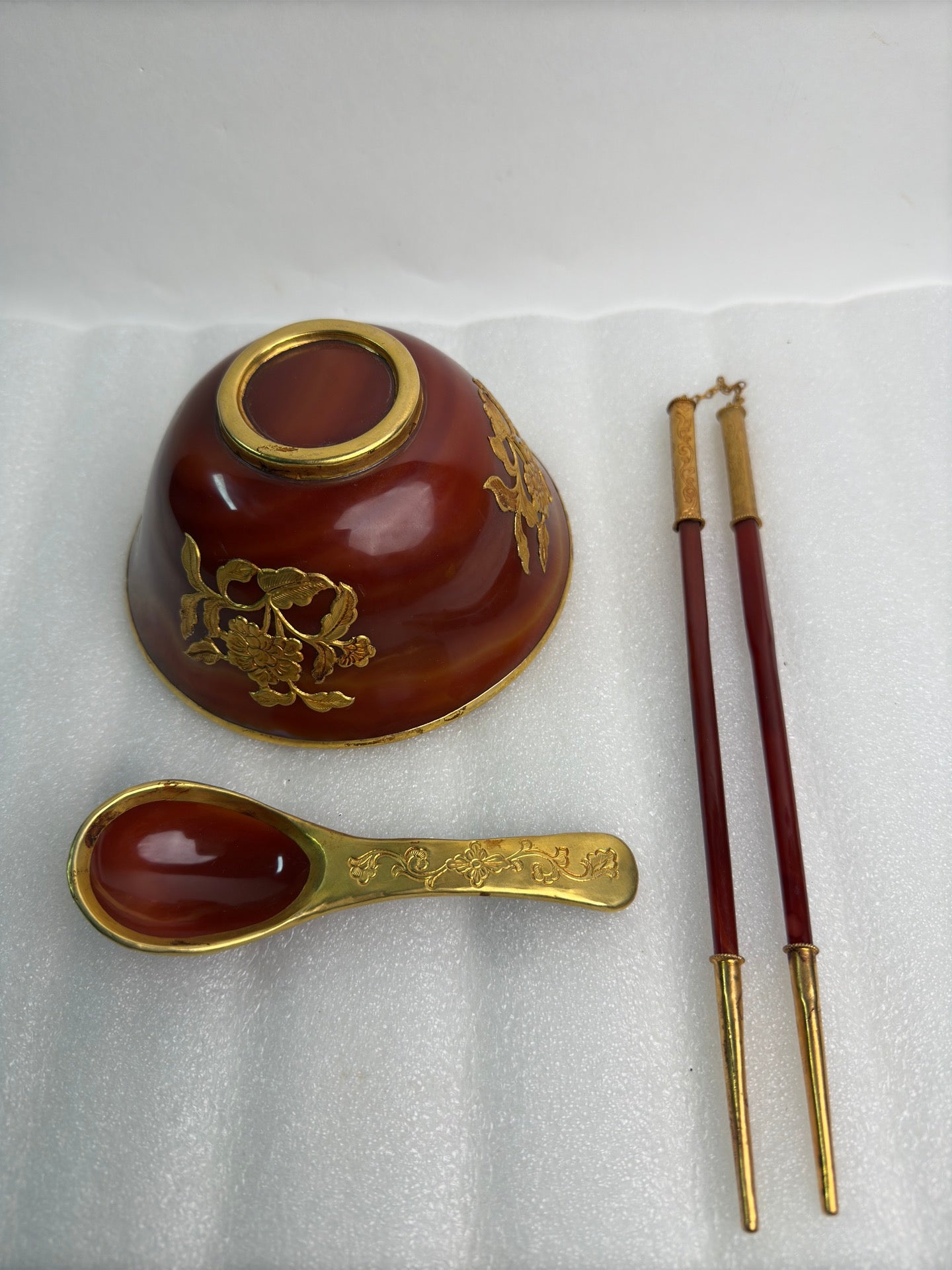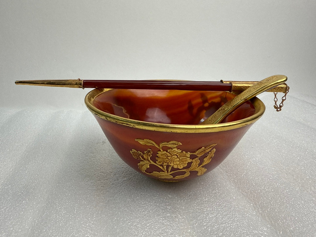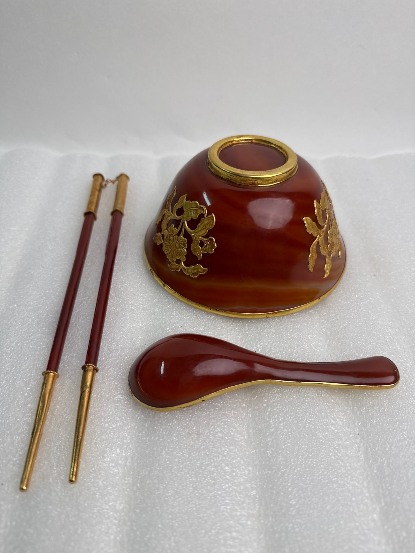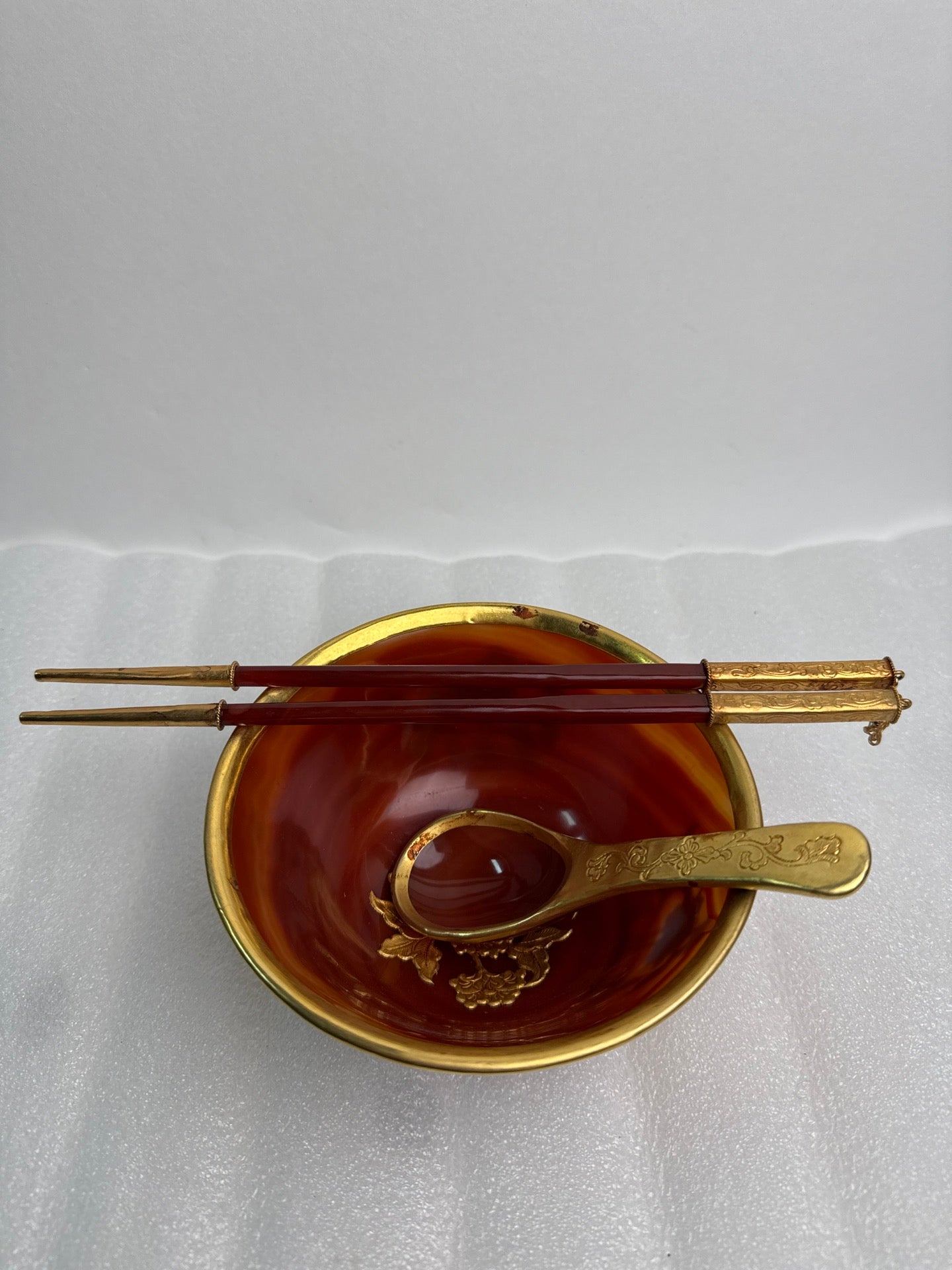 A0598 Chinese Red Agate Inlaying Gold Edge Flower Design Bowl & Chopsticks