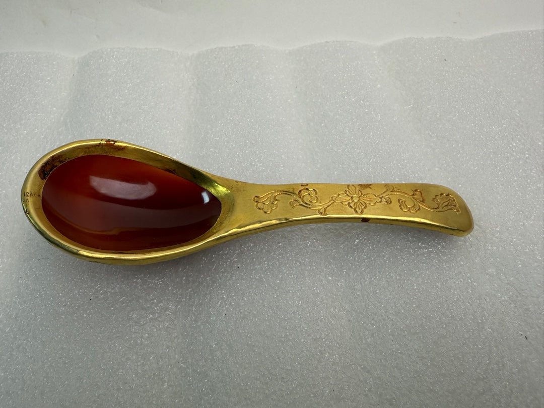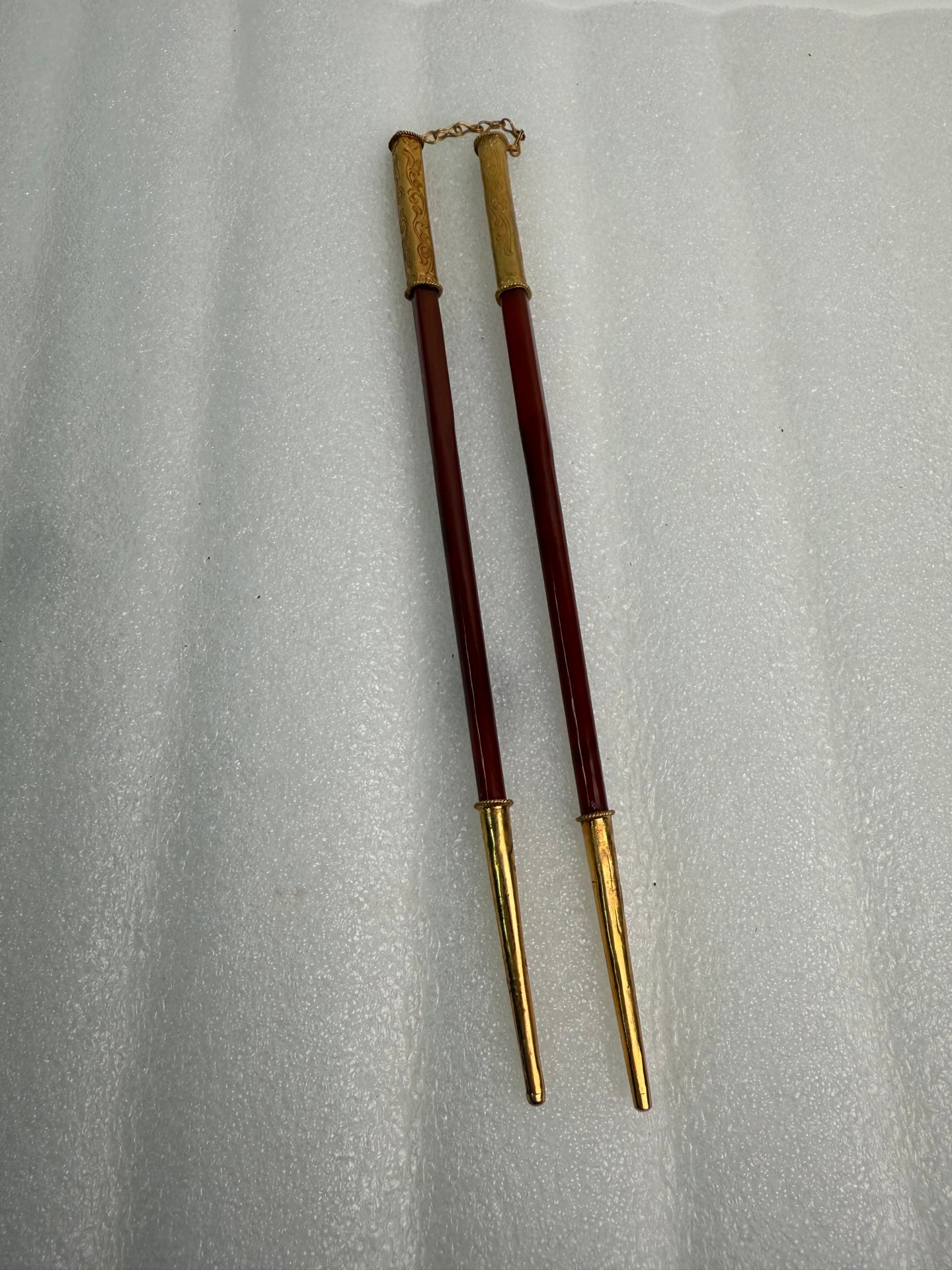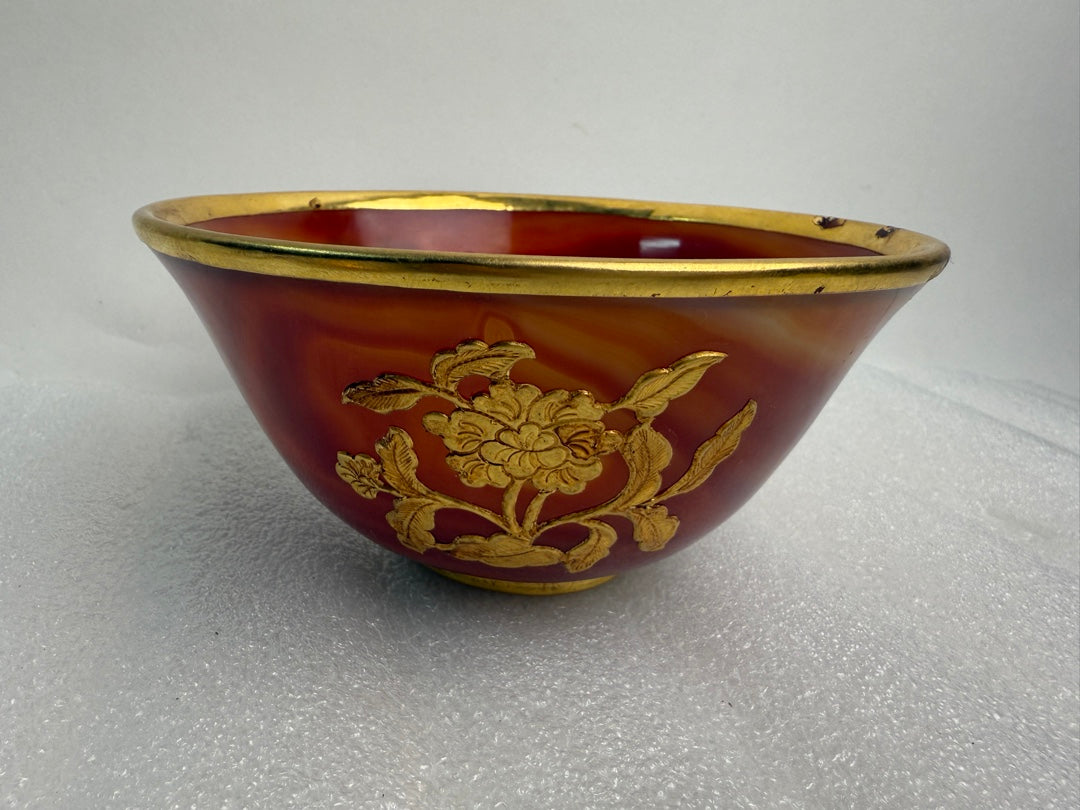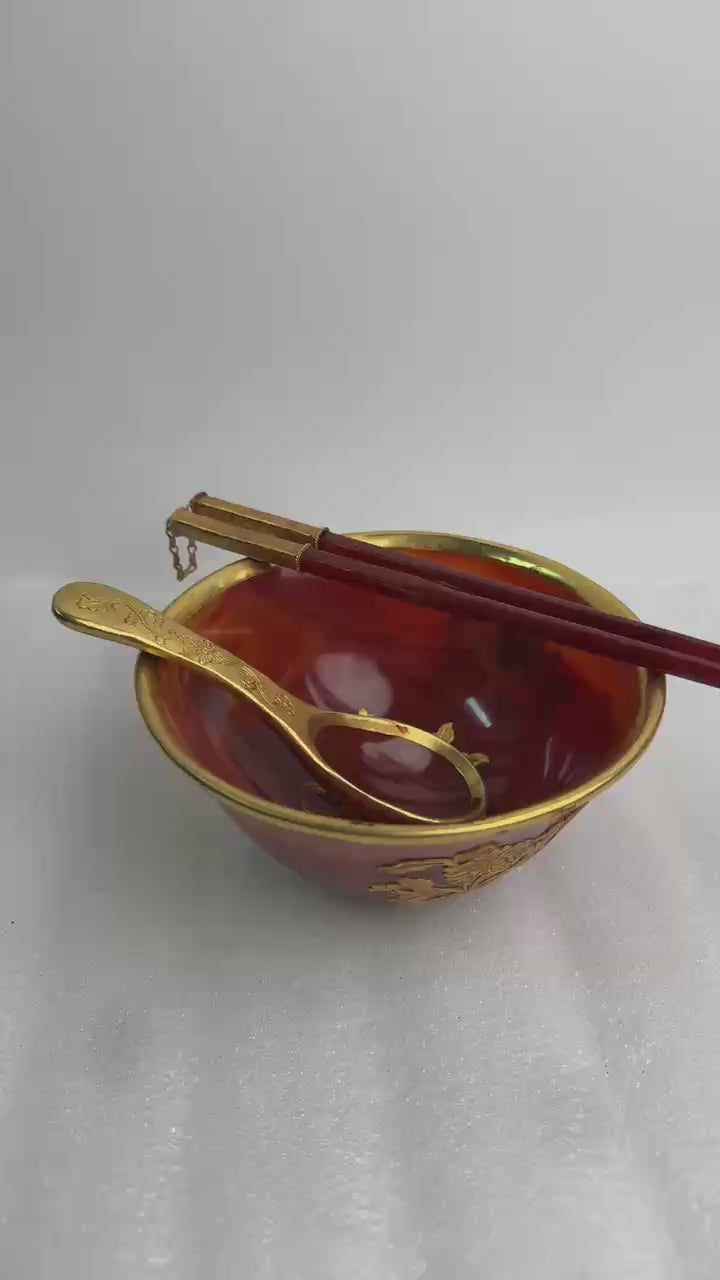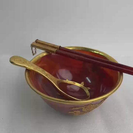 A0598 Chinese Red Agate Inlaying Gold Edge Flower Design Bowl & Chopsticks