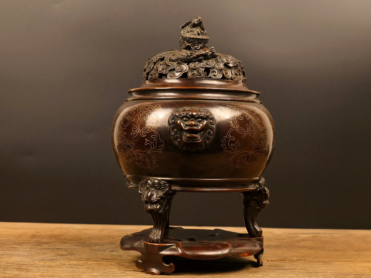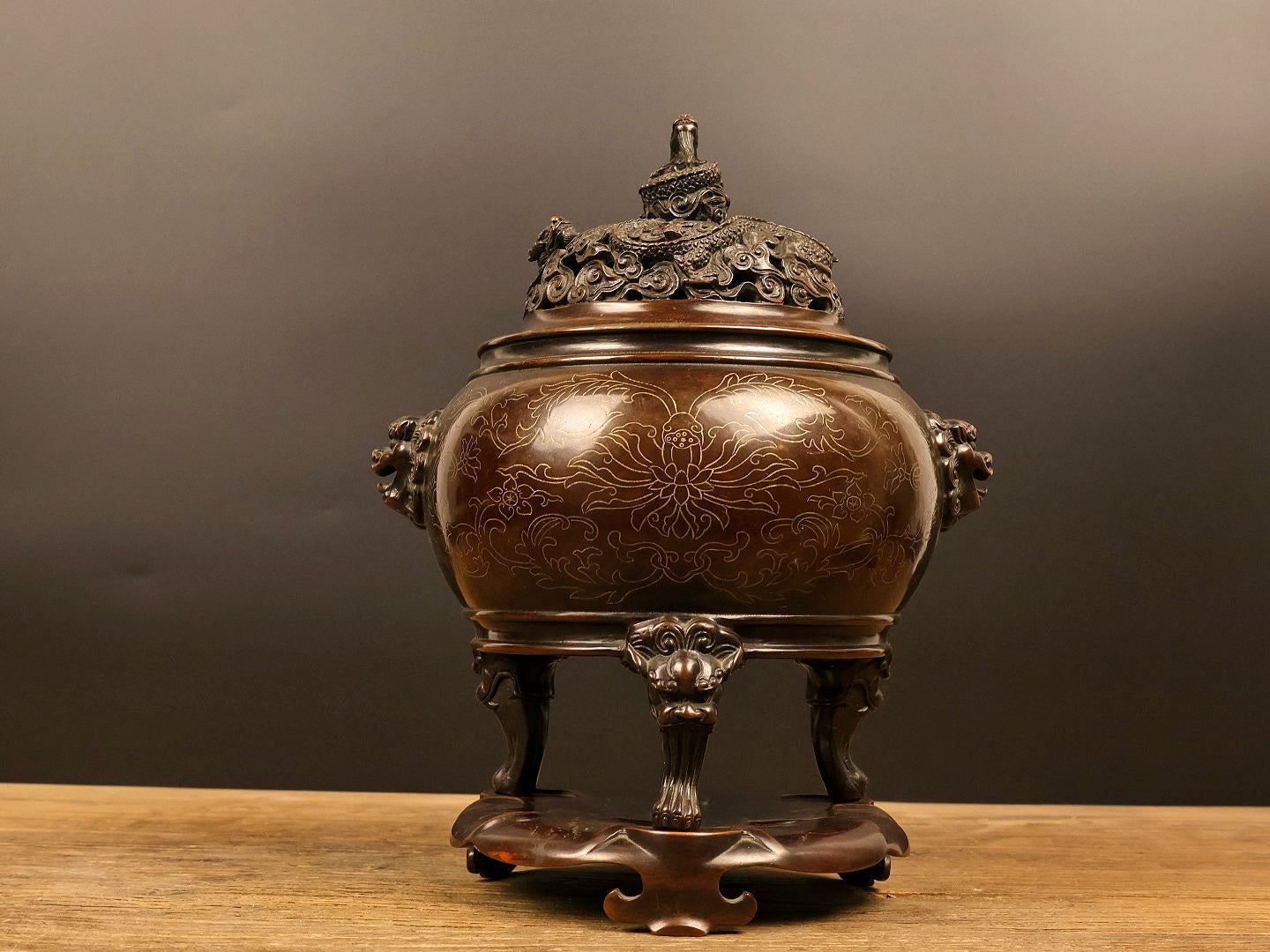 A1033 Vintage Chinese Copper Inlay Silver Wires Double Ears Incense Burner w Base