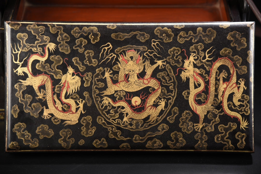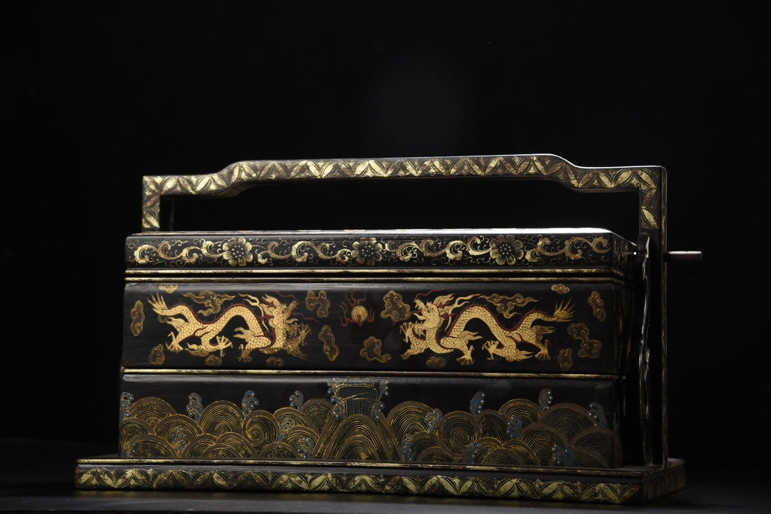 A1076 Chinese Gilt Gold Wooden-cored Lacquerware Fortune Dragon Design Handle Food Box