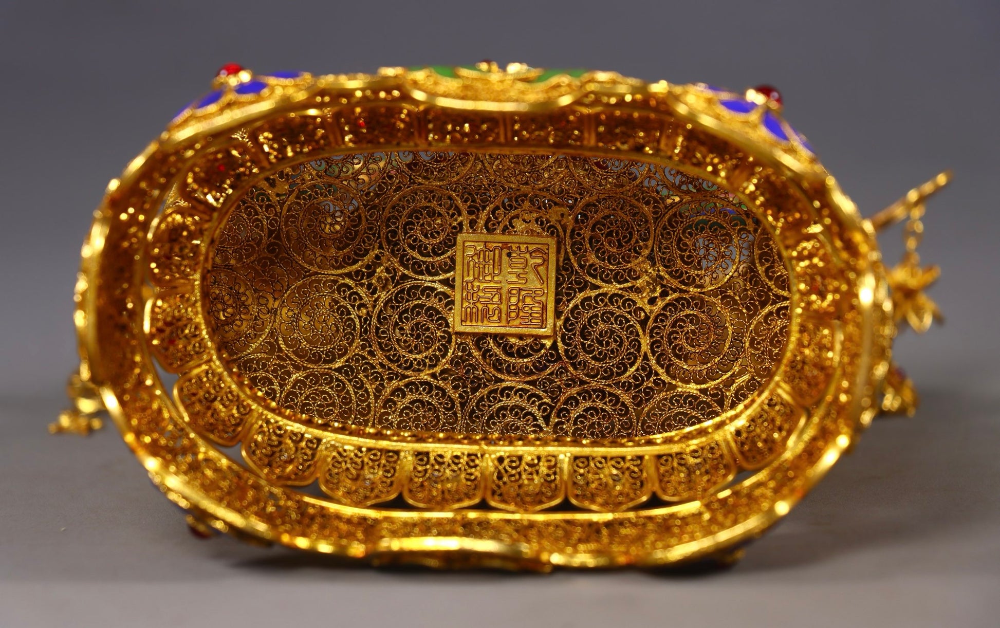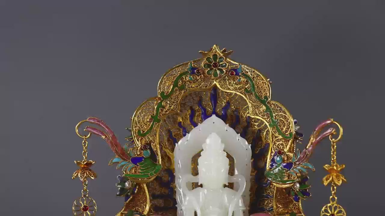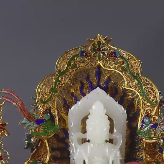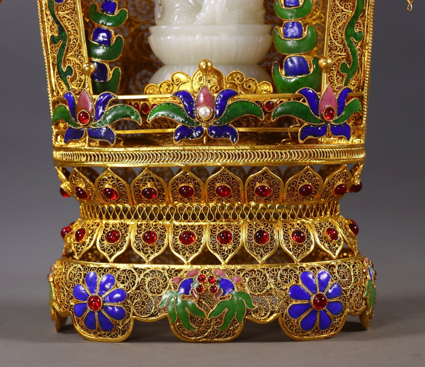 A1186 Exquisite Chinese Hetian Jade Carved Kwan-yin Statue w Gold Wires Enamel Base