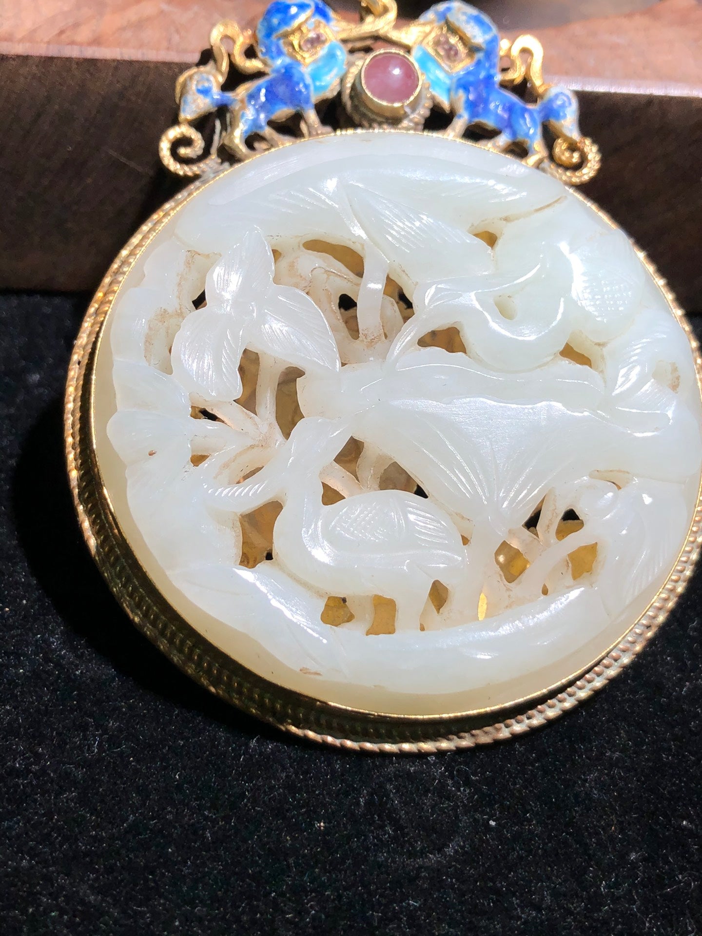 A1409 Vintage Chinese Pure Silver Inlay Hetian Jade Crane & Lotus Leaf Pendant