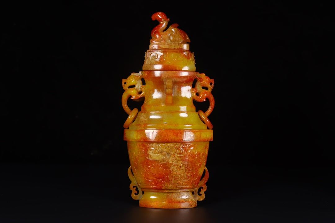A1500 A Pair Superb Old Chinese Hetian Jade Carved Double Dragon Rings Vase